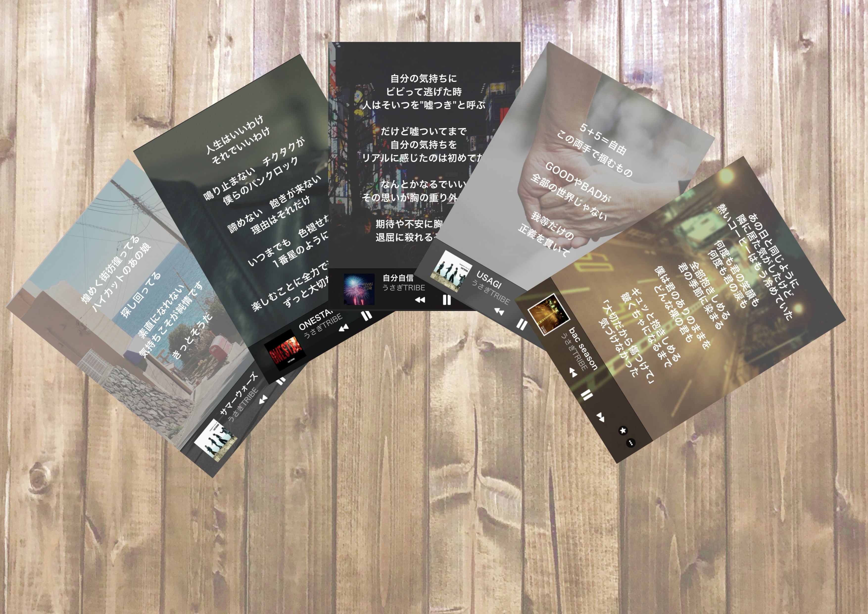ミュージックアプリを再生しているかの様なデザインでうさぎTRIBEで人気な曲のワンフレーズをカードにしました